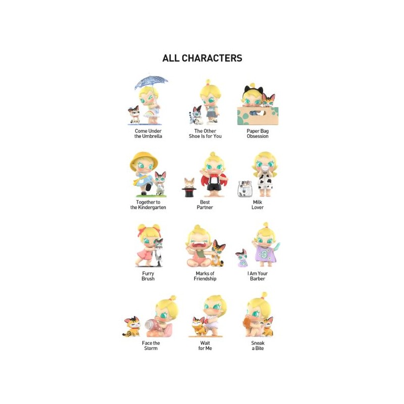 Chaque boîte contient 1 figurine aléatoire du personnage de Molly accompagnée de son chat Tabby, parmi une collection de 12 figurines différentes.