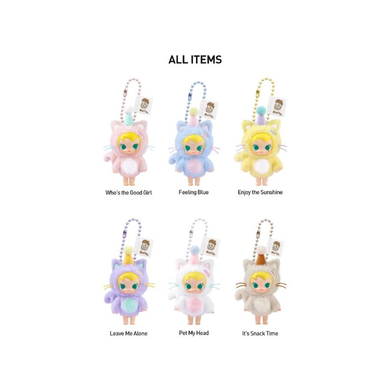 Chaque boîte contient 1 peluche aléatoire du personnage de Molly, parmi une collection de 6 peluches porte-clés différentes.